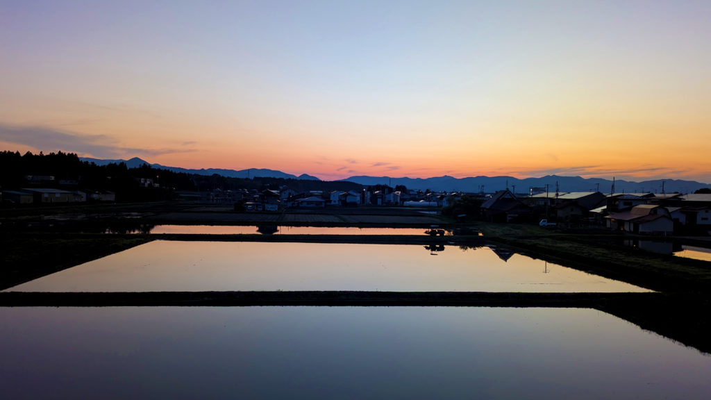 【北上市の風景】水鏡に映る夕焼け空 、一日の終わりに色を添える田んぼ